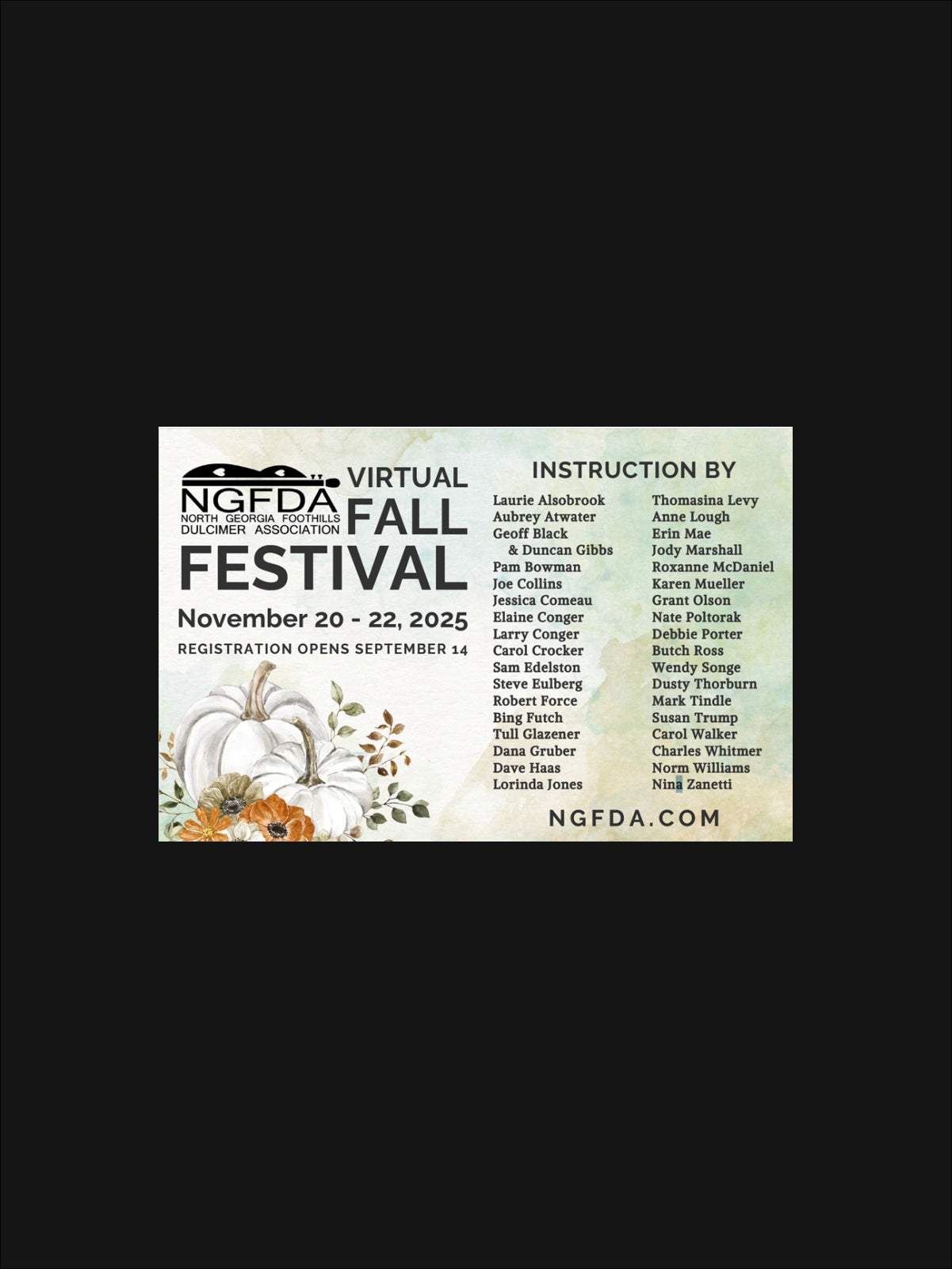 The North Georgia Foothills Dulcimer Association puts on a great virtual festival each fall with dozens of instructors and hundreds of classes. I'll be teaching 9 classes over the 3 day festival on a variety of topics. Each 1-hour class is just $11.50 and will be recorded.