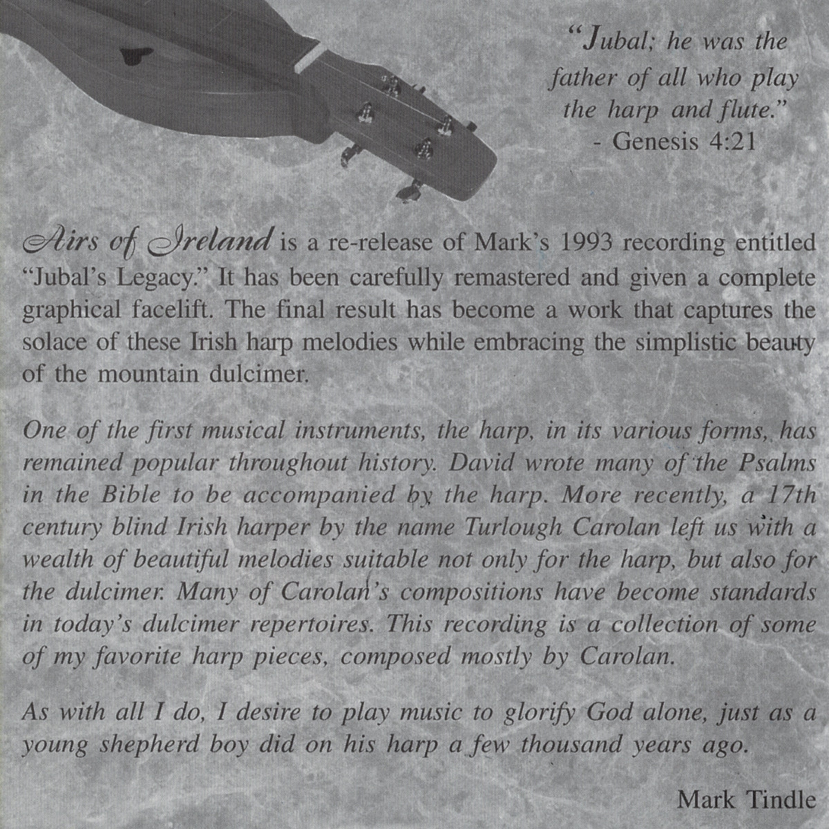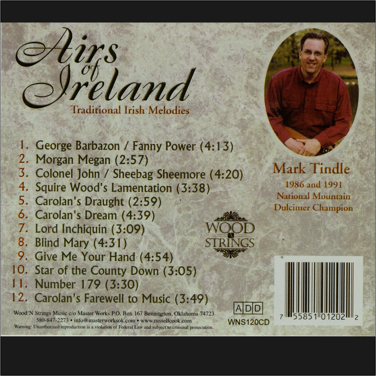 Airs of Ireland is a work that captures the graceful solace of 14 traditional Irish melodies, while embracing the simplistic beauty of the mountain dulcimer. Originally composed for the Irish harp, most of these melodies were written by Turlough Carolan a few hundred years ago. They are performed here on the mountain dulcimer with guitar, & hammer dulcimer.